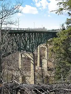 The bridge is 63 metres (207 ft) high and approximately 270 metres (900 ft) long. It cost $1.7 million. When construction was finished in 1962, it was the highest highway bridge in Alberta.[5]