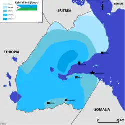 Water is becoming a scarce resource in Djibouti due to climate change, which leads to different rainfall patterns as well as to inefficient methods of distribution within the country. Most of Djibouti's rainfall is in the four months, but over the last 25 years, the Djibouti's Ministry of Environment estimates that rainfall has decreased overall between 5 and 20 percent. It is predicted that in future years, there will be higher temperatures, lower rainfall, and longer droughts, leading to even less access to water. Moreover, seawater intrusion or fossil saltwater contamination of the limited freshwater aquifers due to groundwater overexploitation affect those who live close to the coastline.[4]