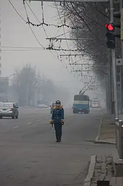 In 2003, air pollution in Pyongyang, largely due to combustion of coal, was reported to be unacceptable.[1][15] This is somewhat mitigated by the high use of public transport in urban areas.[16]