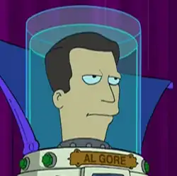 Gore appeared in Matt Groening's Futurama as himself and his own head in a jar in episodes related to environmentalism. Gore also reprised the role in the 2007 film, Futurama: Bender's Big Score.[84] In 2000 Gore had offered to appear in the 2000 season finale of Futurama, "Anthology of Interest I". In this episode, Gore led his team of "Vice Presidential Action Rangers" in their goal to protect the space-time continuum.[85] In 2002, Gore appeared in the episode "Crimes of the Hot".[86] In addition, Gore used a short clip from Futurama to explain how global warming works in his presentations as well as in An Inconvenient Truth.[87] An internet promo for An Inconvenient Truth titled A Terrifying Message From Al Gore was also produced by Groening and David X. Cohen, creators of Futurama, starring Gore and Bender (John DiMaggio).[88]