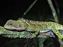 The Enyalioides wood lizard also closely resembles a variety of Asian dragons, such as the Chinese water dragon, and the Tuatara of New Zealand. All have a laterally compressed body and crest running from the head down the back.[4] Although Asian dragons can reach lengths of 3 feet, and the Tuatara measures up to more than 1 foot, the Amazon wood lizards, which are dwarf lizards, have adults reaching only 0.5 ft.[5][6][3]