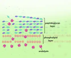 Endolysins are specialized enzymes derived from bacteriophages, viruses that infect bacterial cells in order to replicate within them. Because phages have coevolved with their bacterial hosts, the endolysin system is very efficient at degrading bacterial cell walls.[3] Phages release endolysins from inside bacterial host cells that cleave the peptidoglycan bonds of the bacterial cell wall.[4] Once the cell is lysed, the bacteriophage is able to release progeny virions into the environment which in turn infect more bacterial cells.[5] In addition to degrading bacterial cell walls from within, endolysins are effective when applied externally and can lyse Gram-positive bacteria that lack an outer cell membrane.[6] Enzybiotics utilize endolysins to combat pathogens, exploiting their ability to home in on specific bacterial cells, their nontoxicity toward eukaryotic cells, and a decreased risk of pathogen resistance because they target highly conserved peptidoglycan bonds.[4] A rapid killing rate of bacteria has also been observed upon administration of endolysins due to the enzymatic mechanism, as have synergistic effects among different endolysins and in combination with antibiotics, improving treatment outcomes of bacterial infections.[3]