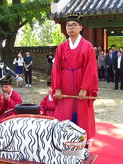 The eo (Korean: 어; Hanja: 敔) or tiger is a wooden percussion instrument carved in the shape of a tiger with a serrated back,[1] played by running a bamboo whisk across the serrations. The instrument is often played to punctuate the ends of sections of music.[2] It is derived from the Chinese yu. On the back of the tiger is a jeoeo (저어, 齟齬) that looks like 27 saws. When the music stops, the performer knocks and scratches this jeoeo through the jin (진) and gives a signal.