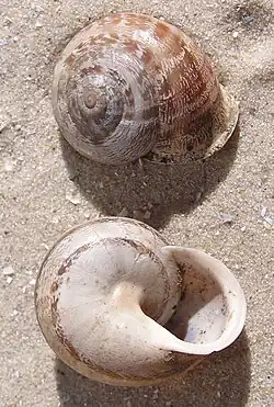 In this species the color of the shell is very variable. The background color can be whitish to greenish yellow, and the shell often has darker coloured bands or spots.[3] The ventral side of the shell frequently has two brown bands, and is whitish between the lowest band and the umbilicus.[3] The shell has 4-4.5 whorls.[3] The last whorl descends abruptly below the periphery of the shell.[3] The apertural margin is white, and is reflected (turned back)in adult shells, in juveniles this is true only on the columellar side.[3] The umbilicus is narrow and open in juveniles, only partly covered by the reflected columellar margin,; the umbilicus is however completely closed in adult shells.[3]