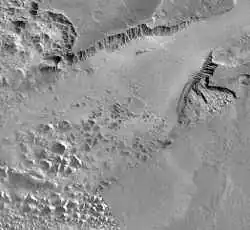 Eos Chaos—lies at southern edge of Eos Chasma, as seen by HiRISE. To see many fine layers click on image. -