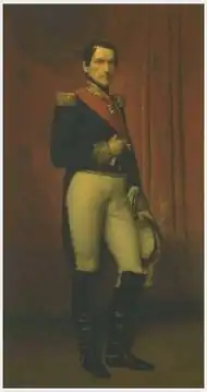 The Epaulettes stamps depicted Leopold I wearing military uniform, with highly visible epaulettes, and were printed using the intaglio method.[1] They were inscribed "POSTES" ("postage") at the top, along with the stamp's value in numbers.[6] At the bottom was the stamp's face value in French language text. No Dutch language version was produced.[5][b] Like the first British stamps, it did not carry the name of its country of origin since they were intended for use only within Belgium. The stamp was designed by Charles Baugniet, based on the King's official portrait painted by the artist Liévin De Winne.[5] Its composition was by Jacob Wiener and the engraver John Henry Robinson.[12] It was not perforated and was instead cut from sheets of 10x10 by hand.[13]