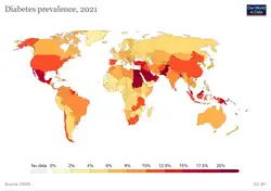 Globally, an estimated 537 million adults are living with diabetes, according to 2021 data from the International Diabetes Federation.[1] Diabetes was the 9th-leading cause of mortality globally in 2020, attributing to over 2 million deaths annually due to diabetes directly, and to kidney disease due to diabetes.[2] The primary causes of type 2 diabetes is diet and physical activity, which can contribute to increased BMI, poor nutrition, hypertension, alcohol use and smoking, while genetics is also a factor.[3] Diabetes prevalence is increasing rapidly; previous 2019 estimates put the number at 463 million people living with diabetes,[4] with the distributions being equal between both sexes incidence peaking around age 55 years old.[5] The number is projected to 643 million by 2030,[1] or 7079 individuals per 100,000, with all regions around the world continue to rise.[5] Type 2 diabetes makes up about 85-90% of all cases.[6][7] Increases in the overall diabetes prevalence rates largely reflect an increase in risk factors for type 2, notably greater longevity and being overweight or obese.[8] The prevalence of African Americans with diabetes is estimated to triple by 2050, while the prevalence of white Americans is estimated to double.[3] The overall prevalence increases with age, with the largest increase in people over 65 years of age.[3] The prevalence of diabetes in America is estimated to increase to 48.3 million by 2050.[3]