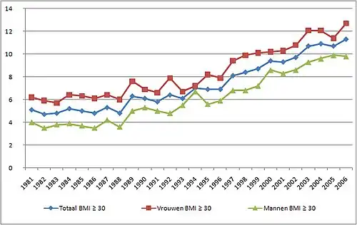 {{cite journal}}: CS1 maint: overridden setting (link) - ^ World Health Organization (2000). Technical report series 894: Obesity: Preventing and managing the global epidemic (PDF). Geneva: World Health Organization. ISBN 978-92-4-120894-9. Archived from the original (PDF) on 26 May 2006.