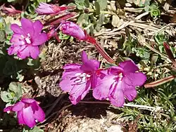 Epilobium obcordatum is a species of perennial plant in the evening-primrose family (Onagraceae), known by the common name rockfringe willowherb and rock fringe.[1] It is native to the western United States from California to Idaho, where it is found in rocky mountainous areas, at altitudes of 7,000 ft (2,100 m) to 13,000 ft (4,000 m).[2] This small perennial is clumpy to mat-forming and spreads from a woody caudex, especially in nooks between rocks. It has stems lined with oval or rounded leaves which spread parallel to the ground or ascend somewhat. At the tips of the thin stems are flowers each with four petals. The petals are magenta to purple, rounded and notched, often in a perfect heart shape, and are one or two centimeters long. The glandular, club-like, ridged fruit is a capsule two to four centimeters long growing on a short stalk.
