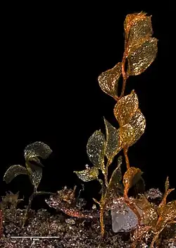 Epipterygium are found in humid and warm regions, mainly in Central America.[4] Epipterygium opararense is the only Epipterygium moss that grows in Australasia.[5] It has 1/2 phyllotaxy (leaves are located one above the other, rotated 180°), which is unique for the genus, which usually has 2/5; it is probably an evolutionary adaptation to the darkness of the habitat.[6] The colour of the plants is pale green or brownish-green, while individual stalks have a yellow or red shade of brown.[7] Several 15-mm unbranched stalks with distichously arranged single leaves grow from a common point.[7] The leaves are elliptic; their dimensions are 1.5–2.1 × 0.7–0.85 mm; the closer they are to the base, the smaller they become.[8] The moss is dioicous and has no sporophytes.[9] The moss seems to be stable on granite surfaces but not elsewhere: it forms only ephemeral colonies in decaying tree trunks; the scarcity of granites in New Zealand might be the reason why the moss is so rare.[10][1]