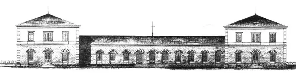The entrance building was built in 1879 according to plans of the Karlsruhe architect Ludwig Diemer in the Italian Renaissance Revival style. The building has belonged since 1 January 2013 to the town of Eppingen and is under heritage protection. It is being restored faithfully for the 2021 State Garden Show (Landesgartenschau), which is to be held in Eppingen.[6] The station has been substantially restored since September 2013.[7]