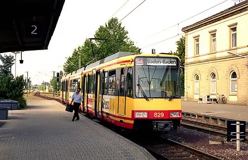 ![]() A Stadtbahn set of the Albtal-Verkehrs-Gesellschaft on platform 2 in Eppingen station | |||||||||||||||||||||||||||||||