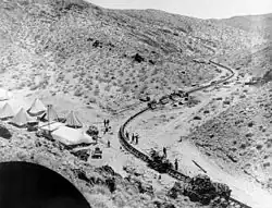 The mine employed 12–15 workers in 1924/25. The epsomite could initially be scraped from the surface using gardener's tools, but the high-quality minerals were quickly depleted, and the remainder was mixed with 50% contaminants of sand, debris and other salts. The return on investment was hampered by the high transportation cost to the factory of the American Magnesium Company in Wilmington, especially caused by the high maintenance cost for the wooden track, which distorted when the beams dried, by initially inappropriate locomotives and by landslides which damaged the track. The mine was closed in 1926. As no buyers could be found for the complete installation, only a small percentage of the initial investments could be rescued during the liquidation of the company.[4]