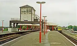 For many years the southern ends of the platforms had a large signal box above them, dating from 1929. It was not listed, and despite extensive roof repairs it was demolished in March 1992.[5]