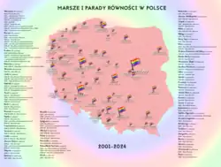 Equality marches or equality parades (Polish: marsze równości; parady równości) are the Polish equivalent of pride parades,[1] which aim to improve LGBT rights in Poland. They have been held in various Polish cities and towns since 2001.[2]