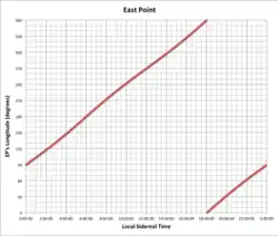 - When L.S.T. is 0h 0m 0s (=0º), East Point's longitude is 90º.