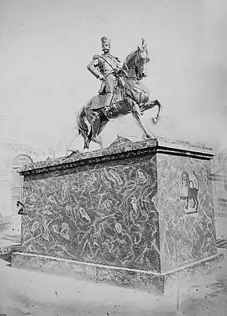 The Equestrian Statue of Naser al-Din Shah was a Bronze statue designed by Iranian sculptor Mirza Ali Akbar. The statue, depicting Naser al-Din Shah Qajaron horseback, was inaugurated in 1888 and commissioned by the director of the Iranian Royal Arsenal for the 40th anniversary of his rule.[1] The Statue was initially designed for Toopkhaneh square, but was eventually placed in the gardens of Bagh-e Shah.[2]
