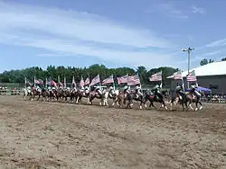 An equestrian drill team[1] is a group of horses and riders performing choreographed maneuvers to music. Teams typically perform at rodeos, horse fairs, parades, benefits, and drill team competitions. Drill teams are intended to entertain, show sportsmanship, horsemanship, teamwork and dedication. Competition drill at the national level is a controlled ride and has continuous forward motion. Some competition venues have set up special divisions of competition to provide for novice, rodeo, youth, gaited and special effects (as allowed at the venue) such as theme and drama. Theme drill provides a division that allows teams to showcase their uniforms, horse ability, music, and inclusions of trick riding or other variations.