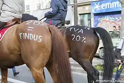 - ^ "VIDEO. A cheval ou en poney, ils défilent dans Paris contre la hausse de la TVA" [VIDEO. On horseback or on pony, they march in Paris against the increase in VAT]. Franceinfo (in French). November 24, 2013. Retrieved February 19, 2025.
