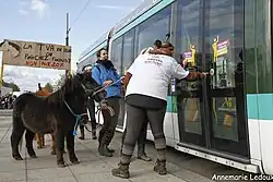 The first demonstrations take place over the All Saints' weekend in Lyon during the Equita'Lyon 2013 trade show.[69] This was followed by movements in Fontainebleau[70] and Rouen on November 6,[71] which brought together 500 people and 130 ponies.[72] In Nancy, on the 7th, 60 horses gathered in Place Stanislas.[73] The same day, in Metz, the demonstration came close to a serious incident, with tear gas being thrown at three riders and a pony.[74] On November 8, 120 people, including 60 riders, marched in Melun and around thirty in Meaux.[75] The demonstration in Dijon on the 9th resulted in another incident: one or two ponies took the tramway with their young riders.[76]
