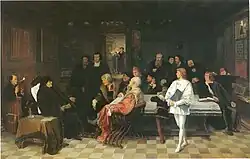 Located on the ground floor, the Rhetoric Room is the place where, according to tradition, Erasmus received visitors. It is adorned with period furniture, as well as the large painting Last Stay of Erasmus in Basel in 1535 (1907) by Félix Cogen, where an elderly Erasmus is seen listened to by other humanists and scientists gathered in the office of the printer Johann Froben.[11] Above the fireplace hangs a painting of Adrian VI, canon of the chapter of Anderlecht, tutor to the future Charles V and the only pope from the Netherlands.[6]