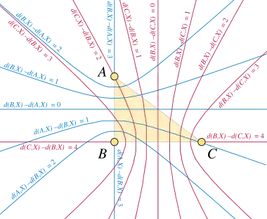- Let denote the Euclidean distance function. For any given point , the integer is at most , by the triangle inequality. Thus, lies on one of hyperbolas, defined by equations of the form with . These are shown in blue in the figure. For this equation instead defines two rays extending in opposite directions on the line through and (also shown in blue); this pair of rays can be treated as a degenerate hyperbola for the purposes of the proof.