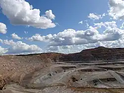 The city was built in 1978 to exploit Asia's largest deposit of copper ore and is the fourth largest copper mine in the world.[1] The Erdenet Mining Corporation is one of the Mongolian state-owned enterprises and accounts for a majority of Mongolia's hard currency income. Erdenet mines 22.23 million tons of ore a year, producing 126,700 tons of copper and 1954 tons of molybdenum.[2] The mine accounts for 13.5% of Mongolia's GDP and 7% of its tax revenue.[3] The mine employs about 8,000 people.[4]