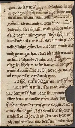 - MS V (St. Pölten, Landesarchiv, Ständisches Archiv, Hs. 821), a single sheet in Bavarian dialect dating from the third quarter of the 14th century.[28] It comprises the last 31 lines of the poem.[31]