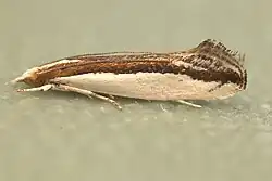 ♂♀. 4+1⁄2"-5+1⁄2". Head white, sides of crown narrowly brownish-ochreous. Palpi white, second joint of labial palpi dark fuscous externally except at apex, both joints loosely haired. Antennae whitish, with obsolete dark fuscous annulations. Thorax ochreous brown, with a narrow white longitudinal central stripe. Abdomen whitish-ochreous. Legs white, anterior tibiae and tarsi obscurely suffused with dark fuscous above, middle tarsi with dark fuscous rings at base of joints. Fore-wings glossy snow-white; a broad ochreous-brown streak along inner-margin from base to anal angle, posteriorly attenuated, containing some blackish, scales on inner margin; this streak is margined above by a blackish streak, commencing at base as a slender line and dilating gradually to anal angle, where it is as broad as the inner-marginal streak in middle, thence continued along hind-margin to apex, its upper edge obtusely dilated about middle of hind-margin, produced into apical cilia as a short straight projecting bar; base of costa slenderly blackish; a small cloudy subcostal blackish spot before middle; two slender blackish oblique streaks from costa, first beyond middle, very short, nearly obsolete, second midway between first and apex, longer, its apex confluent with the hind-marginal streak; cilia whitish, with three broad cloudy blackish-fuscous lines. Hind-wings and cilia white, extreme apex and two obscure lines round it fuscous.[4]