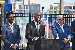 Barron speaks at a press conference on violent crime in Baltimore with Mayor Brandon Scott (left) and Governor Larry Hogan (right), 2022