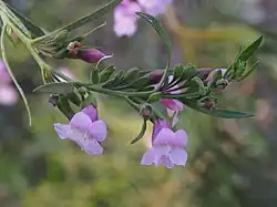 The flowers appear in groups of 3 to 6 in leaf axils on flattened stalks 7–15 mm (0.3–0.6 in) long. There are 5 slightly overlapping, egg-shaped, pointed, hairy, green, shiny sepals, 3.5–5.5 mm (0.1–0.2 in) long. The petals are 15–18 mm (0.6–0.7 in) long and joined at their lower end to form a tube. The petal tube is a shade of pink to purple on the upper surface and white or pale pink below. The outside of the tube and the petal lobes are hairy but the inside surface of the lobes is glabrous while the inside of the tube is filled with long, soft hairs. The 4 stamens are fully enclosed in the petal tube. Flowering occurs in August to September and is followed by fruits which are an oval shape, compressed, glabrous and about 4 mm (0.2 in) long.[2][3]
