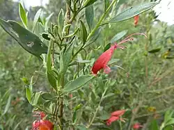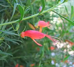 Eremophila decipiens, commonly known as slender fuchsia bush or narrow-leaved fuchsia bush (although it is not closely related to Fuchsia) is a flowering plant in the figwort family, Scrophulariaceae and is endemic to an area extending from the south-west of Western Australia to southern parts of South Australia. It is low, sprawling shrub with lance-shaped leaves and red, orange or yellow flowers on a long, S-shaped stalk.