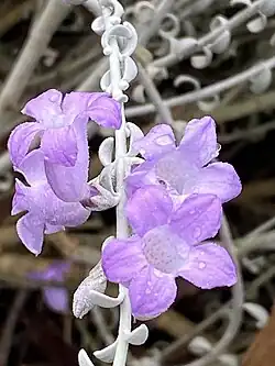 This species rivals the popular Eremophila nivea as a specimen plant in the garden. It flowers abundantly in spring featuring its lilac-coloured to purple flowers and whitish-grey leaves which curl away from the stem. It can be grown from cuttings or by grafting onto Myoporum, preferring well-drained soils and full sun. It is drought tolerant and resistant to all but the most severe frosts.[8]