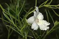 Twiggy emu-bush is an ornamental shrub which is well known in horticulture, and some specimens have been grown for more than 35 years. It flowers profusely in summer, bearing masses of white flowers when most other shrubs are dormant and is a useful screening plant, with its dense, tangled branches. Propagation is easiest from cuttings which strike within a few weeks in warm weather and its arching branches sometimes develop roots when they touch the ground. A very drought tolerant shrub, it only requires watering once or twice during a long drought and a deep watering early in summer will sometimes stimulate a mass flowering. It is also tolerant of frost and can be pruned, preferably in early autumn.[11][12] A hybrid with E. divaricata called Eremophila 'summertime blue'[13] is popular in American gardens.[14][15][16]