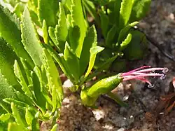 The flowers are borne singly or in pairs in leaf axils on stalks mostly 4–7 mm (0.2–0.3 in) long but are mostly or partly hidden by the leaves. There are 5 green, overlapping, egg-shaped to lance-shaped sepals which are 6–7 mm (0.2–0.3 in) long but enlarge to 10–11 mm (0.39–0.43 in) long after flowering. The petals are 15–26 mm (0.6–1 in) long and are joined at their lower end to form a tube. The petal tube is lime-green or yellowish-green, with red or brownish purple markings on the top lobe. The petal tube and its lobes are glabrous apart from some hairs on the lowest lobe and inside the tube. The 4 stamens extend beyond the end of the petal tube and are the most conspicuous part of the flowers. Flowering mainly occurs between March and December and is followed by fruits which are dry, almost spherical, 6.5–10 mm (0.3–0.4 in) long with a grey, papery covering.[3][4][5]
