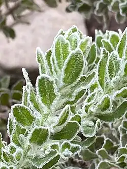 Eremophila subfloccosa, also known as dense-felted eremophila[2] is a plant in the figwort family, Scrophulariaceae and is endemic to Australia. It is a shrub which often has foliage covered with soft hairs, giving the plant a silvery grey hue and making it soft to touch. The leaves are strongly scented when crushed. Its flowers are usually greenish yellow in colour and have the stamens protruding from the ends. Dense-felted eremophila is common after fire, but becomes less so as others recover and compete with it.