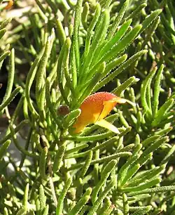 Eremophila subteretifolia is classified as "Threatened Flora (Declared Rare Flora — Extant)" by the Department of Environment and Conservation (Western Australia).[5] It is listed as "Endangered" (EN) under the Australian Government Environment Protection and Biodiversity Conservation Act 1999 (EPBC Act)[6] and an interim recovery plan has been prepared.[7] In 2002, the total wild population was estimated to be 119 mature plants occurring in six locations to the south of Lake King. Threats to the species include increasing salinity, waterlogging, road maintenance, vehicle damage and grazing by rabbits (Oryctolagus cuniculus).[7]