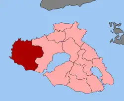 Eresos-Antissa (Greek: Ερεσός-Άντισσα) is a former municipality on the island of Lesbos, North Aegean, Greece. From the 2010 local government reform until 2019 it was part of the municipality of Lesbos[2] and since 2019 it is a municipal unit of the municipality of West Lesvos.[3][4] It is located in the westernmost part of the island, and is the largest municipal unit of the island in land area at 290.947 km².[5] Its population was 4,259 at the 2021 census. The seat of the municipality was in Eresos. The next largest towns are Antissa, Mesótopos, Vatoússa and Chidira.