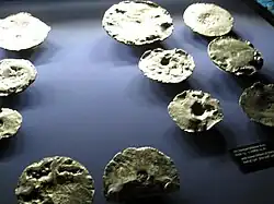 The treasure was discovered in 1998 by archaeologists in the Michaelisstrasse under the wall of a cellar entry. It consists of silver coins and ingots as well as over 700 extraordinary works of goldsmith work dating to the 13th and 14th centuries. The majority of the treasure is made up of 24 kilograms (53 lb) of silver coins and ingots. The 3141 coins are all Tornesel, from the late 13th and early 14th century, thus making up the largest single find of this type of coin. In addition, there are 14 ingots of various sizes, with all of them except one stamp marked.[2]