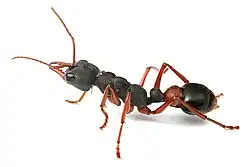 An ergatoid (from Greek ergat-, "worker" + -oid, "like") is a permanently wingless reproductive adult ant or termite.[1][2] The similar but somewhat ambiguous term ergatogyne refers to any intermediate form between workers and standard gynes.[1][3] Ergatoid queens are distinct from other ergatogyne individuals in that they are morphologically consistent within a species and are always capable of mating, whereas inter caste individuals, another class of ergatogynes, often are not.[1][3] Ergatoids can exhibit wide morphological differences between species, sometimes appearing almost identical to normal workers and other times being quite distinct from both workers and standard queens.[1][4][5][6] In addition to morphological features, ergatoids among different species can exhibit a wide range of behaviors, with some ergatoids acting only as reproductives and others actively foraging.[1][7] Ergatoid queens have developed among a large number of ant species, and their presence within colonies can often provide clues on the social structures of colonies and as to how new colonies are founded.[4] Without wings, almost all species of ants that solely produce ergatoid queens establish new colonies by fission.[6][7][8]