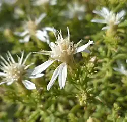 Ericameria resinosa is a shrub up to 50 cm (20 inches) tall. It has leathery thread-like or narrowly oblanceolate leaves up to 25 mm (1 inch) long, with resinous glands on the surface. The flowers form at the tips of branches and are surrounded by a denser cluster of reduced leaves. Flower heads are white, with 10–15 disc florets and 0–7 ray florets.[7][8] Its habitats include rocky plains, steep hillsides, and rocky cliffs, usually rooted in rock crevices.[8]