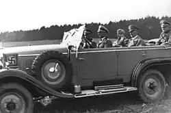 As his chauffeur, Kempka usually drove one of Hitler's black Mercedes cars from a fleet of six to eight that were stationed in Berlin, Munich, and other places. Unless in the company of an important person, Hitler would sit in the front, next to Kempka, with a valet behind him.[5] When travelling in motorcades, Hitler's car would be followed by two cars to the left and right, one with FBK men and the other with a detachment of Reichssicherheitsdienst (Reich Security Service; RSD) men.[6] Further behind would be a car with his adjutants and physician, and more cars for press agency representatives, stenographers, and provisions. Later in July 1938, upon Kempka's directive a fully armor-plated Mercedes was built and delivered in time for Hitler's 50th birthday of 20 April 1939. The car had 18 mm steel plate and 40 mm bullet-proof glass.[4][5]