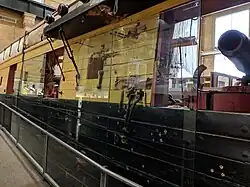 The centerpiece exhibit on the first floor of the museum features a reconstruction of the midships section of USS Lawrence. The replicated Lawrence, Commodore Oliver Hazard Perry's first flagship during the Battle of Lake Erie, comes complete with mast, spars and rigging to foster hands-on learning in the ways of sail handling. Another display is the adjoining section of the Lawrence' replica that has been blasted with live ammunition from the current Niagara's own carronades at the National Guard training facility in Fort Indiantown Gap, near Harrisburg. This "live fire" exhibit of Lawrence recreates the carnage inflicted upon both ships and men during the Battle of Lake Erie and throughout the Age of Fighting Sail.[7]