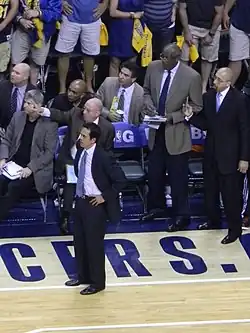 Expectations of the team's success were raised significantly for the next season and beyond, after the free agent acquisitions of LeBron James and Chris Bosh in the summer of 2010. After the team started off the 2010–11 season with a 9–8 record, some Heat players reportedly were "frustrated" with Spoelstra, and questioned if he should remain their head coach.[25] Chris Bosh intimated that the team was being worked too hard and that the players would rather "chill".[26] LeBron James famously bumped into Spoelstra on his way to the bench during a timeout in a game.[27] These two issues, coupled with the relatively poor start to the season, put Spoelstra on the coaching hot seat. The team bounced back, however, and made the playoffs while posting the second-best record in the Eastern Conference. Spoelstra led the Heat to an appearance in the 2011 NBA Finals, but lost to the Dallas Mavericks in six games. After Spoelstra failed to win a championship during his first season as head coach of the "big three" (James, Wade, and Bosh), Heat executive Pat Riley was asked if he would consider returning to coach the team.[28] Riley, however, turned down the idea and supported Spoelstra as the head coach going forward.[28] Spoelstra received a $6 million contract extension in December 2011 which lasted through the 2013–14 NBA season.[29]