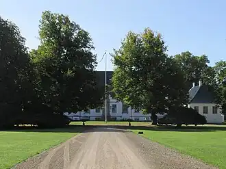 Designed in the Neoclassical style, Eriksholm is built in white-washed brick and consists of three wings under a black-glazed tile roof.[3] The semicircular buildings which connect the main wings to the lower and short lateral wings are typical of the contemporary English Palladianism.[4] The window frames and portals are made of sandstone from Bornholm.[3]