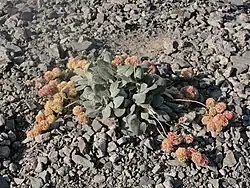 This is a low-lying perennial with a woody caudex spreading to about 40 centimeters in maximum width. It forms a patch of round, paddle-shaped, woolly, gray-green leaves one to twenty centimeters wide in rocky areas. Its inflorescence is rarely erect, instead drooping or extending parallel to the ground, rarely higher than 15 centimeters.