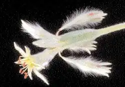 It is described as generally having no more than three flowering stems, but stronger plants may have more. Its flowers are described as emerging from an involucre or protective cup found on each branch of its terminal corymb.[2] Flowers are pollinated by a variety of solitary bees, solitary digger wasps and twig nesting wasps, flies and social wasps.[3]
