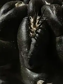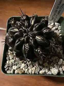 This is a globular cactus that when sun stressed, turns to a dark purple, making it look as if the plant was black and when in shade, is green. This is used in horticulture to determine if enough light is being given to the plant. This plant's throns are long and black, and look like hair. The ribs are turbiculed.[3]