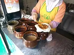 It is also sold as the popular street food kăo ĕrkuāi (烤饵块) or shāo ěrkuāi grilled and rolled around a yóutiáo (strip of fried dough), with sweet or savory condiments added, making a rolled-up snack resembling a Mexican burrito.[2] The sweet type contains a sweet brown sauce and peanuts, while the savory type is spread with lǔfǔ and bean sprouts, and various other toppings. Kăo ĕrkuāi is particularly popular in the tourist area of Dali.