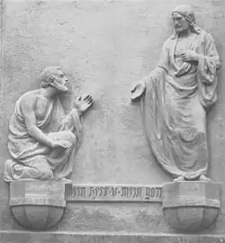 The church has an exterior relief by Hermann Lang, showing Thomas and Jesus, with Thomas acknowledging Jesus as the redeemer,[8] and two reliefs by Ernst Neumeister after Fischer's designs. The altar and the pulpit are made from yellowish marble from Verona. The large painting in the apsis was created by Linda Kögel. Jesus on a throne, surrounded by angels, sits above scenes from parish life such as baptism, wedding and funeral, with portraits of parish members at the time.[5]